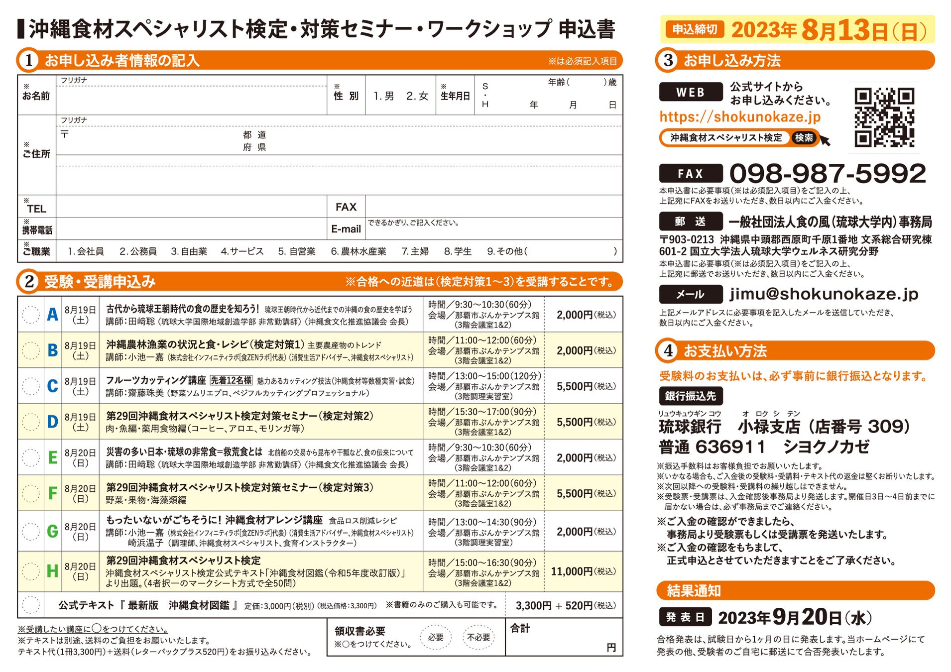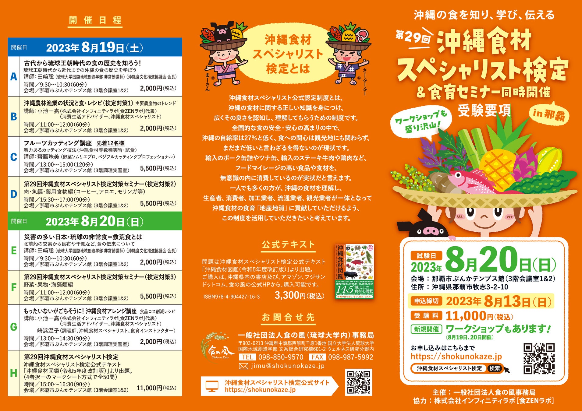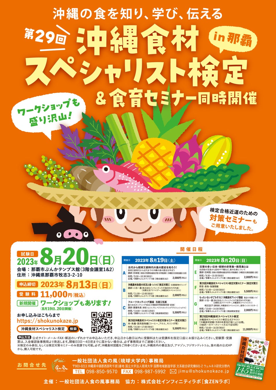 第29回沖縄食材スペシャリスト検定試験は8月20日(日)に開催します。また沖縄食材スペシャリスト対策セミナーは8月19日(土)&20日(日)に各コマにて実施いたします。食育を学び直したい方々には、食育ワークショップも同時開催いたします。どなたでも申込可能です。皆様からのご応募御待ちしております。