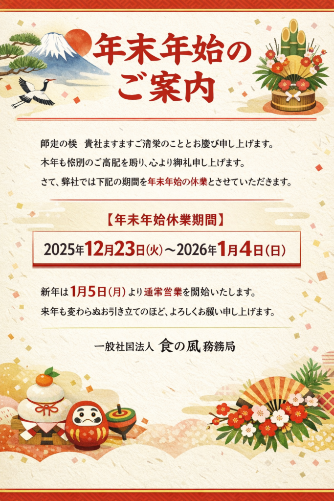 さて、弊社では下記の期間を年末年始の休業とさせていただきます。