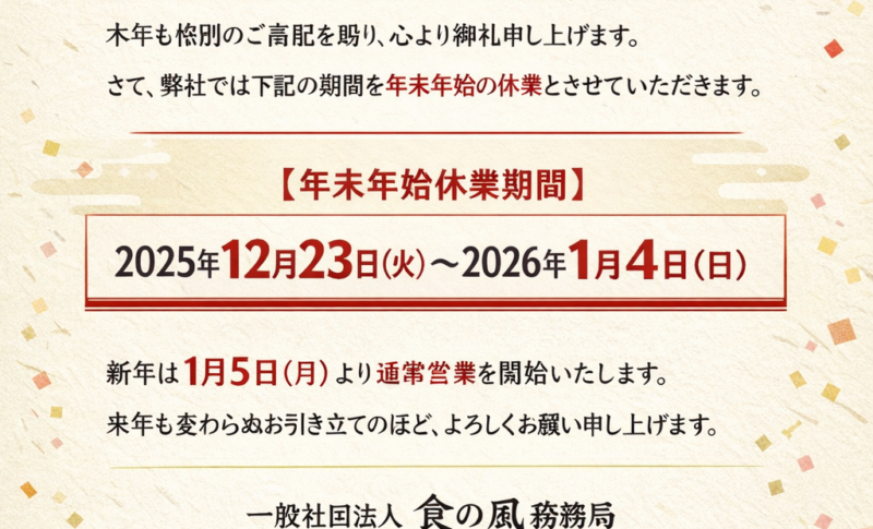 さて、弊社では下記の期間を年末年始の休業とさせていただきます。