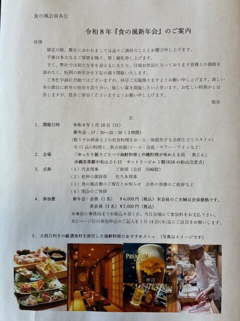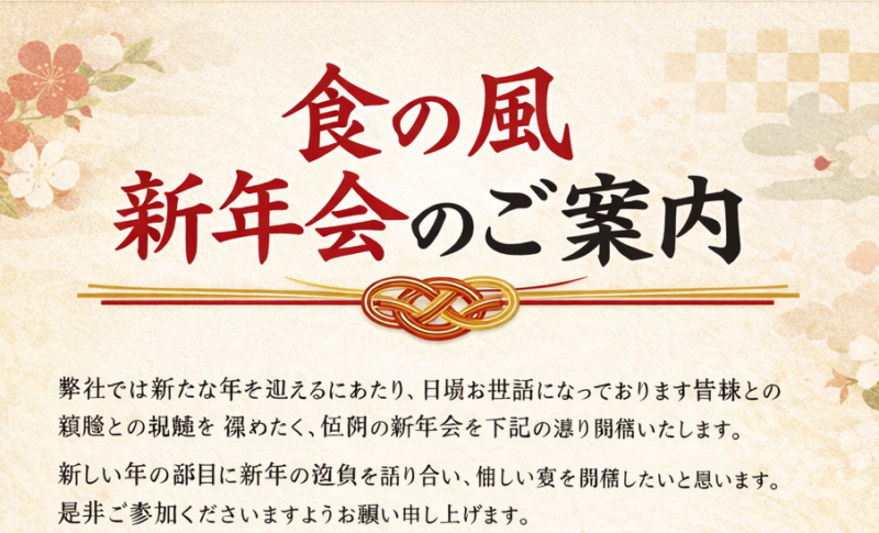 さて、新たな年を迎えるにあたり、日頃お世話になっております皆様との親睦を深めたく、恒例の新年会を下記の通り開催いたします。